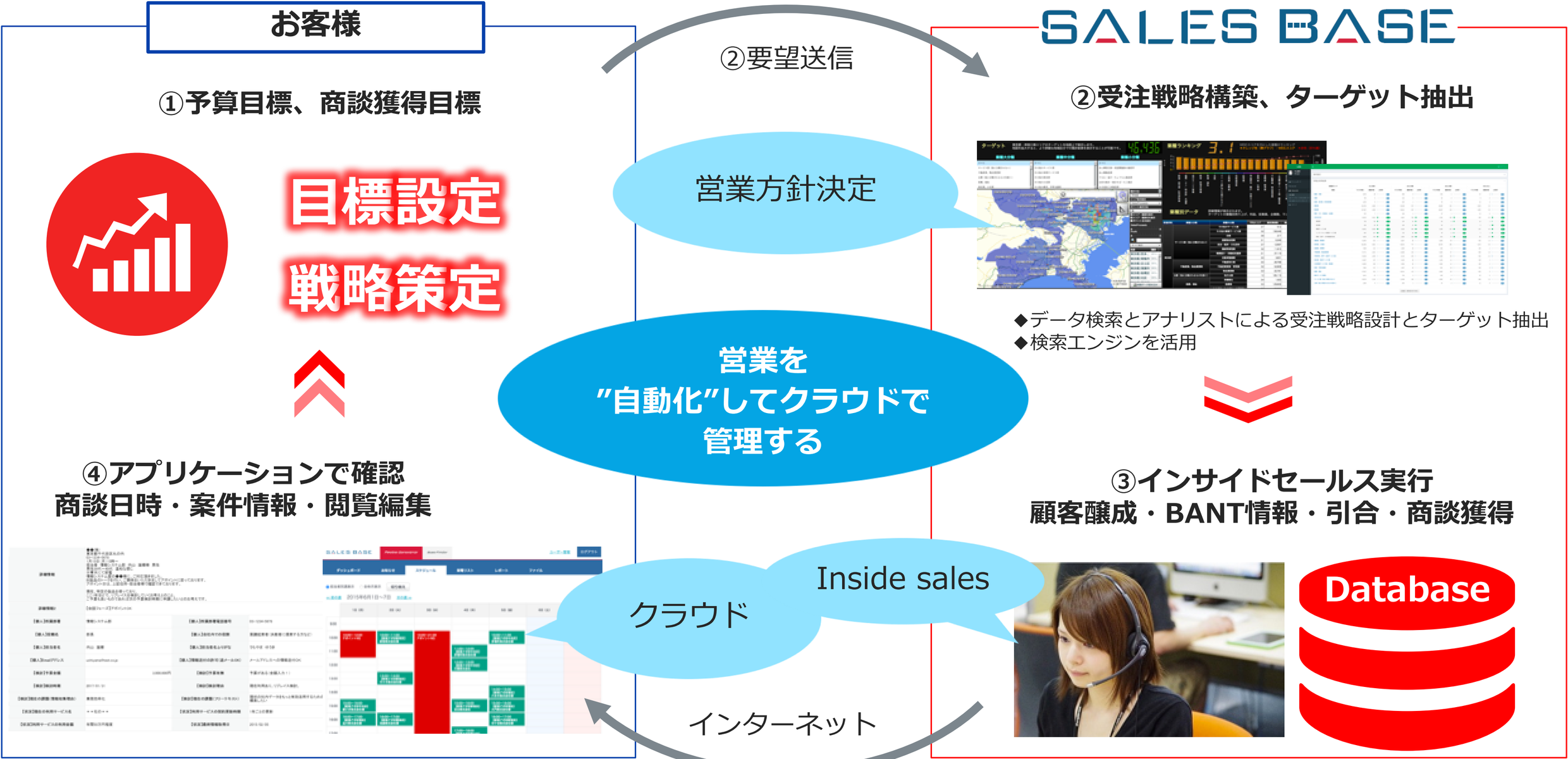 「SALES BASE」は、AIによるビックデータ解析を通じて受注戦略を構築し、ターゲットを抽出。情報管理とその可視化も行い、当社コンタクトセンターによるインサイドセールスを一気通貫で行うプラットフォームです。ターゲット企業の担当者リードと商談アポイントが届くので商談件数増加と受注率向上が期待できます。WEICはこのサービスの提供を通じて日本の営業活動を変えていきたいと考えています。将来的には全ての売りたいと買いたいが繋がる、そんなサービスに育てていきます。 一緒にやりたい方、ご興味のある方、是非お気軽にお問い合わせください。